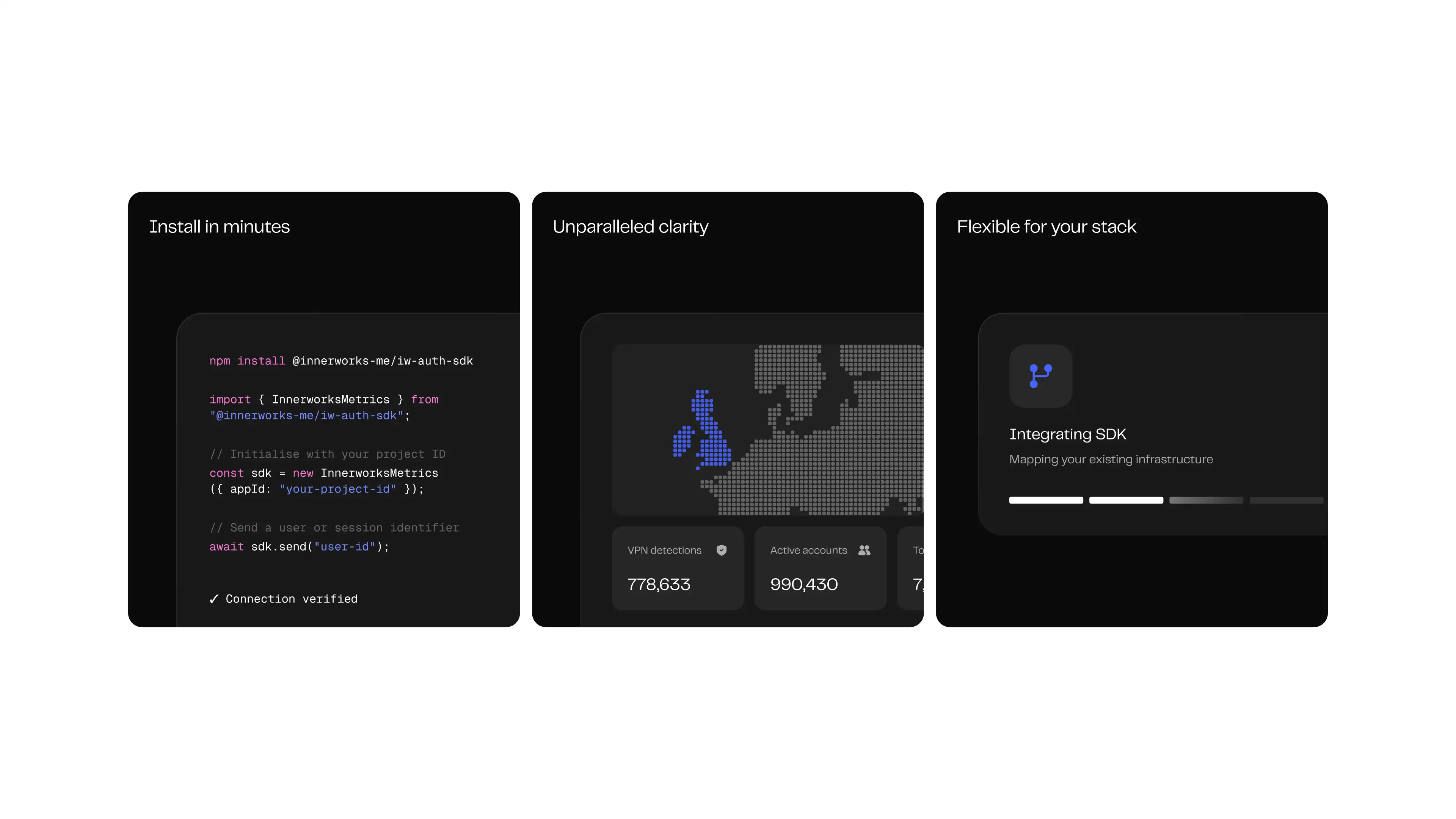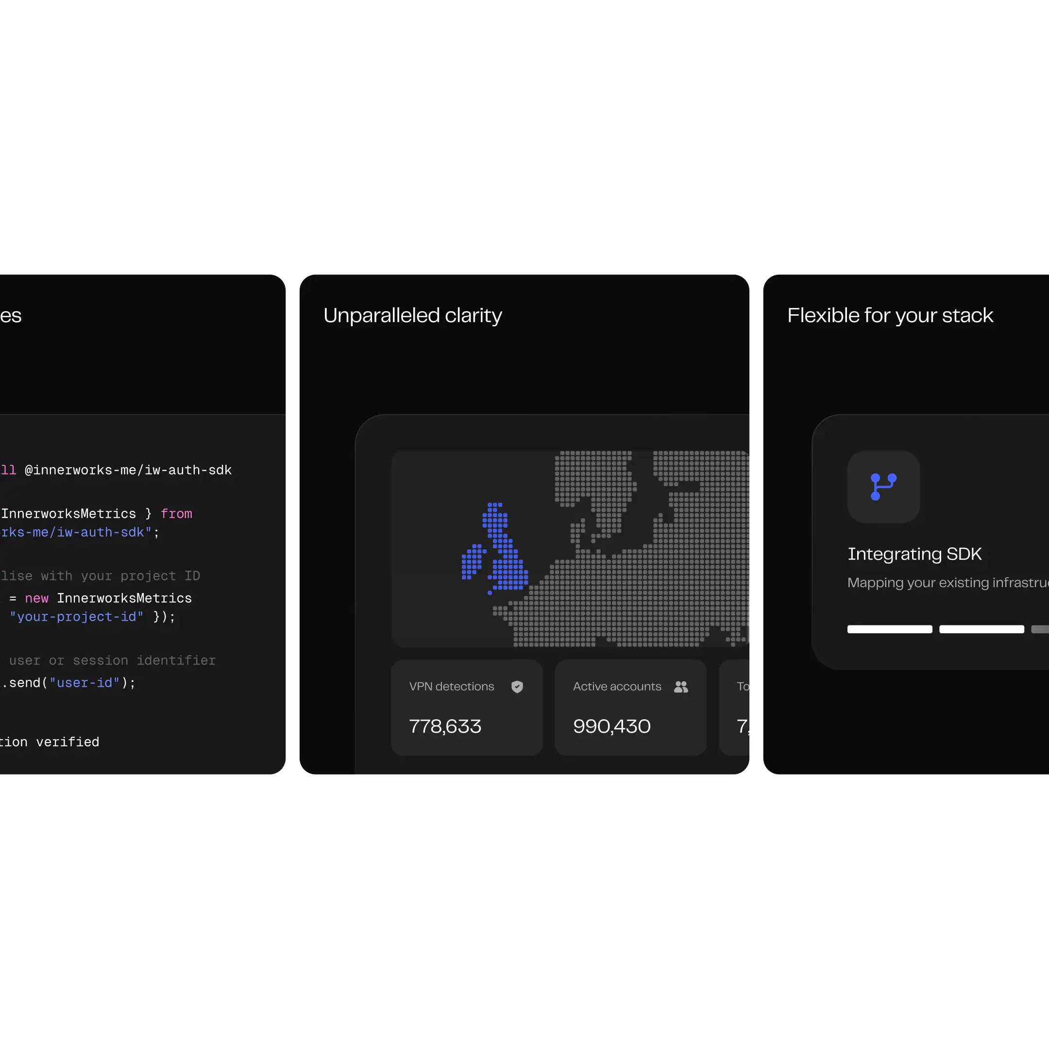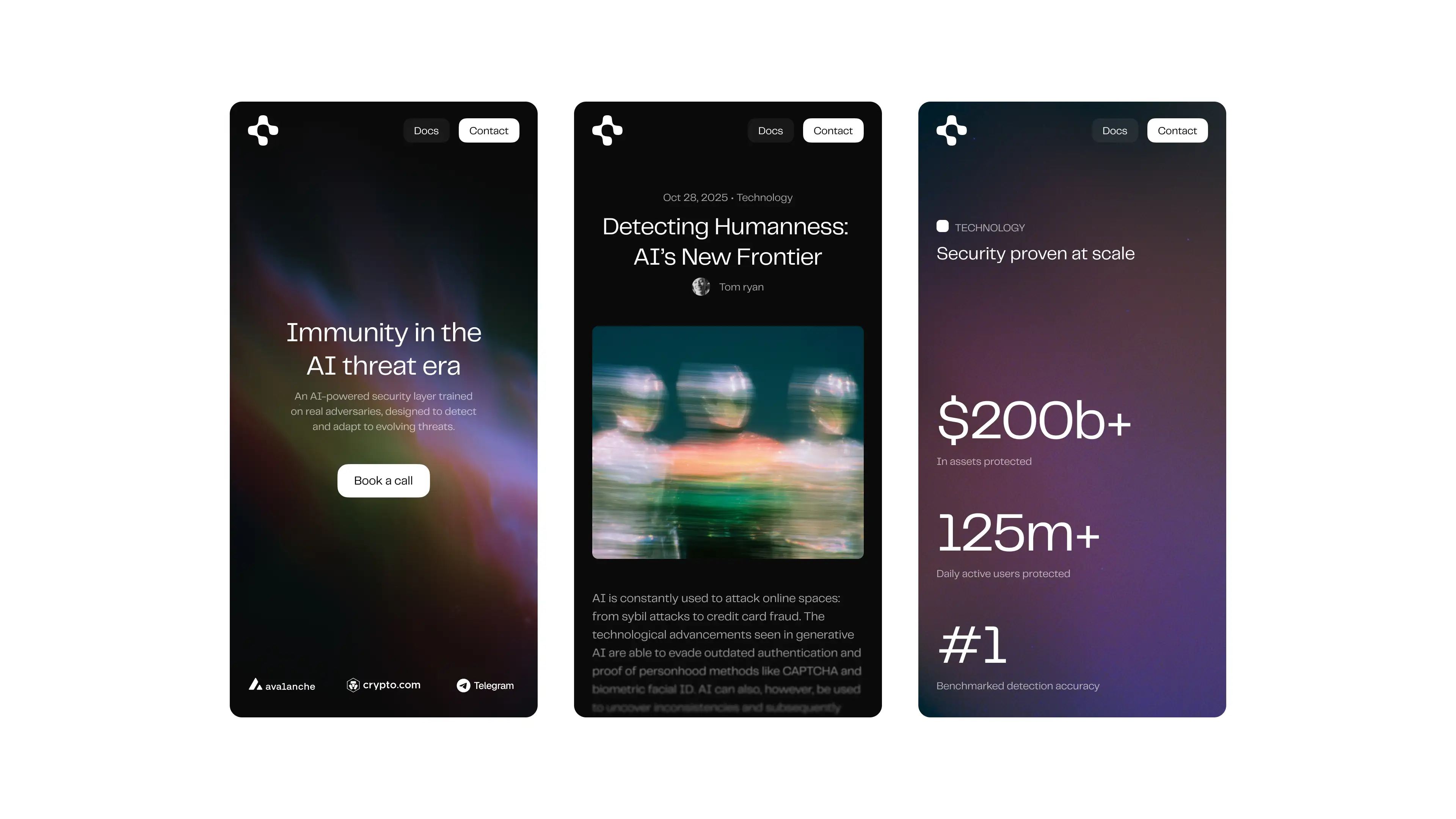 Innerworks is an AI-powered security platform designed to act as an adaptive immune system for the internet, continuously detecting bots, synthetic identities, and coordinated attacks across modern platforms. The system is trusted by leading companies including Telegram, Crypto.com, and Avalanche. We partnered closely with the founders to shape the product narrative, visual language, and core materials, translating complex security infrastructure into a clear, credible story across the website, investor deck, and sales assets.